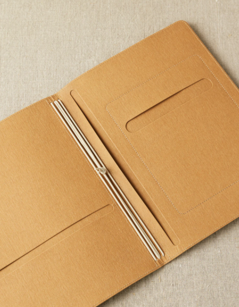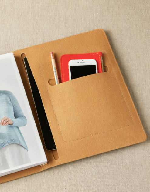 Like many knitters, I am mostly digital these days...but there is something so appealing about a good pencil and paper - I don’t think I’ll ever give them up completely.  But how to travel with book, journal, worksheets, magazines, patterns...and maybe also a tablet or cell phone and pencil? I started with the idea of a Japanese travel journal, with the elastic bands to secure books and magazines. Then played around with layers of kraft fabric to create pockets for tablets, patterns, pencil and cell phone. The entire portfolio is washable and you can change out the elastic to personalize the colors. Stylish and organized - what’s not to love?