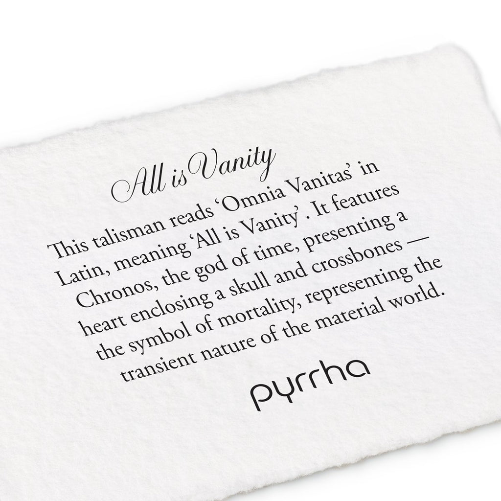 This talisman reads 'Omnia Vanitas' in Latin, meaning 'All is Vanity'. It features Chronos, the God of Time, presenting a heart enclosing a skull and crossbones-the symbol of mortality, representing the transient nature of the material world.