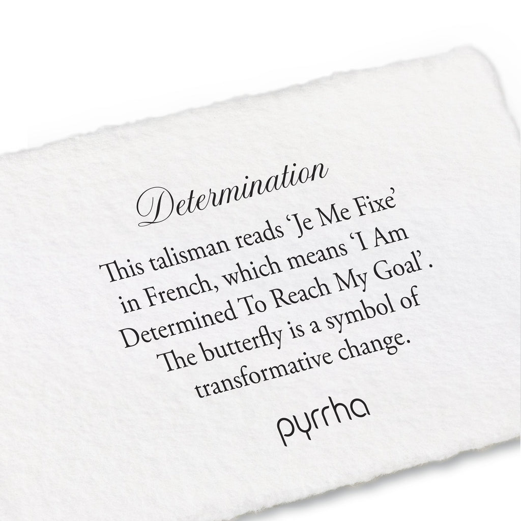 This talisman reads 'Je Me Fixe' in French, which means 'I Am Determined To Reach My Goal'. The butterfly is a symbol of transformative change.